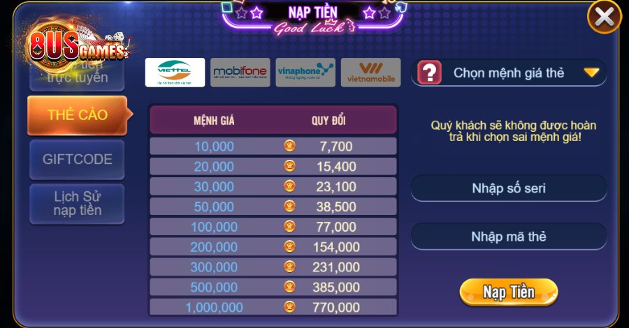 Ngoài 2 hình thức trực tuyến phía trên, 8US còn cung cấp thêm hình thức thẻ cào tiện dụng. Với đa dạng nhà mạng khác nhau từ Viettel, Mobifone, Vinaphone cho đến Vietnamobile. Trước khi tiến hành nộp tiền vào tài khoản, các bạn nên chuẩn bị trước thẻ cào có sẵn và thực hiện như hướng dẫn sau.